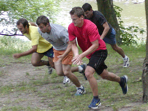 Krátké sprinty do kopce, na vrcholku Lukáš Daňo, Martin Koudelka a Jiří Kadlec