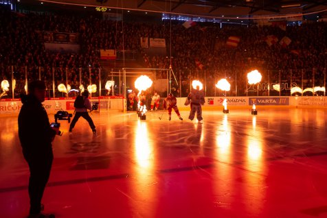 Po slavnostním nástupu s ohni a zaznění státní hymny proběhlo ještě čestné vhazování. Poté už mohl první finálový duel začít. První zákrok si po minutě připsal Ondřej Kacetl, když vychytal do lapačky pokus Jordanna Perreta z levého kruhu. Mountfield nadále pokračoval ve své aktivitě. Další útočnou kombinaci zakončoval Jan Eberle, který vyslal svižnou střelu, Kacetl byl však pozorný. Hradecký útočník si navíc v sobotním sedmém semifinále připsal 700. start v extralize.