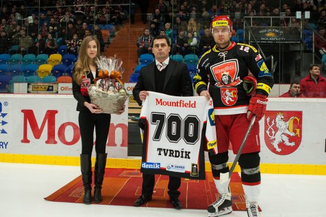 Ještě před prvním buly nastala slavnostní chvíle, Michal Tvrdík totiž nastoupil ke svému 700. zápasu v české nejvyšší soutěži. První třetina toho ale příliš slavnostního nenabídla. Hrálo se hlavně ve středu hřiště, útoky nedokázaly překonat defenzivy.