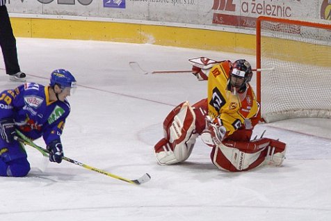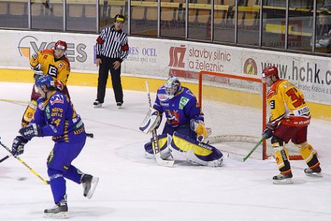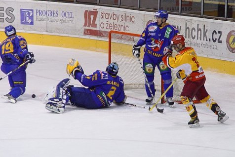 Ve třetí třetině pondělní drama gradovalo, nejprve ve vlastním oslabení překvapil Lukáše Sáblíka střelou z úhlu Pavel Suchý a Hradec vedl 3:1. Před třetím gólem mohli ale hradečtí minimálně dvakrát inkasovat, zachránil je však gólman Koutský a poté také notná dávka štěstí. Zkušení hosté se vrátili do utkání v 56. minutě, Robert Kysela si v přesilové hře chytře počkal u pravé tyče domácí branky a po přihrávce Sýkory pohotově snížil na rozdíl jedné branky. Když už se zdálo, že si Východočeši dokráčejí pro tři body, nekompromisně ztrestali hosté jejich zaváhání v obraně. Důrazný David Pazourek v 57. minutě vyrovnal na 3:3.