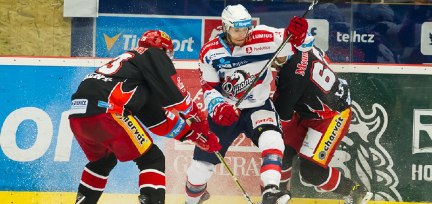 Východočeské derby začalo pěkně zostra. Oba týmy bojovaly o každý kousek ledu a svému soupeři nedaly zadarmo ani milimetr prostoru. Hned v úvodu se mohl proti svému bývalému extraligovému klubu prosadit Koukal, jeho jedovatá rána z levého kruhu ale jen rozezvučela horní tyčku.